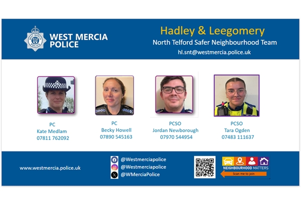 Hadley and Leegomery SNT surgeries and Mobile Police station times and dates for Nov 2025 |