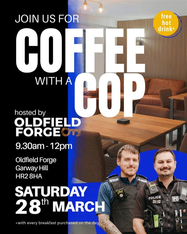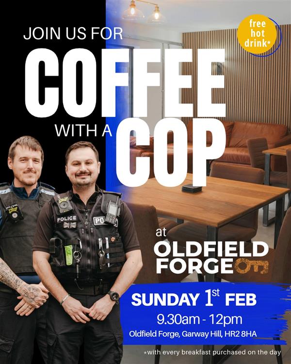 Your Local Policing Team would like to invite you to join us for our upcoming Coffee with a Cop sessions at Oldfield Forge Café, Old Field Farm, Garway Hill, Hereford HR2 8HA.