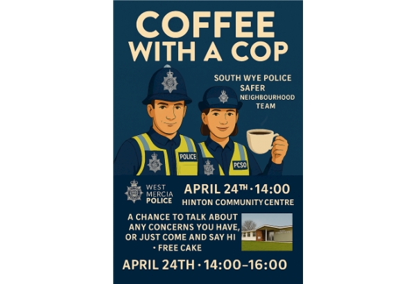 South Wye Safer Neighbourhood Team will be holding a Coffee with a Cop on Friday 24 April, at Hinton Community Centre, from 2:00pm–4:00pm in the café.