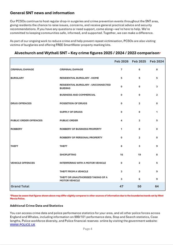 Please find attached to this email a copy of the ‘Alvechurch and Wythall SNT Monthly Newsletter - March 2026’ edition which provides various information including a overview of what your Safer Neighbourhood Team have been up to during the last month within your area. Residents of Alvechurch , Beoley and Wythall parishes will now have a new way to stay informed about the work being done to help keep their communities safe, thanks to the launch of a monthly newsletter from the Alvechurch and Wythall Safer Neighbourhood Team (SNT). The newsletter aims to provide regular monthly updates on the team’s actions, initiatives, and community engagement efforts. From tackling anti-social behaviour and speeding concerns, to supporting vulnerable residents and attending local events. The newsletter will highlight the work being done in direct response to issues raised by the public and your Parish Council.
